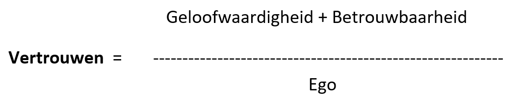 Misschien vraag je je af: Wat betekent vertrouwen concreet? Of: Hoe werk je actief aan vertrouwen in je team? Hiervoor gebruiken wij een eenvoudige en praktische formule die vertrouwen opdeelt in drie elementen: geloofwaardigheid, betrouwbaarheid en ego.